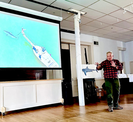 A new summer and fall iteration of EAC's Sunday Talks, long a favorite pastime of residents in the winter months, ran successfully from July through October. Pictured below are shark experts, author Ret Talbot and illustrator Karen Talbot, who enthralled a crowd on October 6. Photos by Manuela Brice and Paula Horvath.