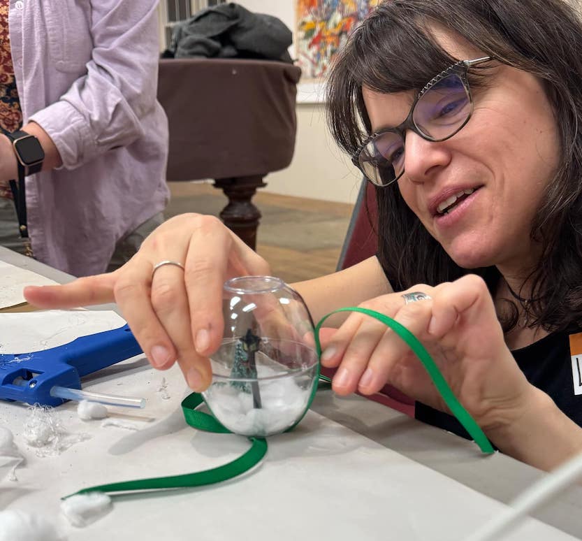 Despite windy and wild weather (which resulted in a dozen-hour power outage for Eastport and surrounding communities), EAC's Ornament Making Party, held on the evening of Wednesday, December 11, was a great success. Attendees included family groups, visitors to the area, and a few adults new to crafting. Instructors Sara Myrick, Ann Cannizzaro and Nia Aretakis each devised their own project for participants: upcycled snow globes; shell ornaments; and painted ‘elf stars’. The trio of instructors were energetic yet gentle, guiding participants to express themselves with a wide variety of materials. The EAC was full of happy chatting voices, glitter aloft, and plenty of hot glue successfully tying it all together. A special guest of the event was Alison Brennan, EAC's former Education & Outreach Coordinator and the person who originally dreamed up the ornament making party concept.